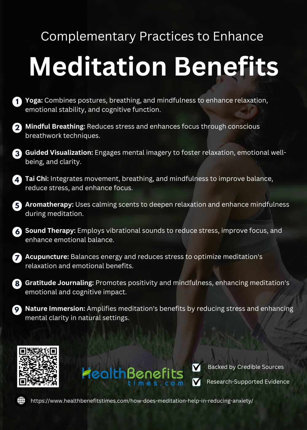 Meditation supports cognitive behavioral therapy (CBT) by enhancing mindfulness, reducing rumination, and fostering emotional regulation. Mindfulness-based cognitive therapy (MBCT), which integrates meditation, effectively addresses anxiety and depression, reinforcing CBT outcomes (26). Meditation improves attention and relaxation, critical components of CBT, and helps patients adapt to stressors more effectively (27). Additionally, meditation-based CBT techniques show significant improvement in managing chronic mental health conditions (28).