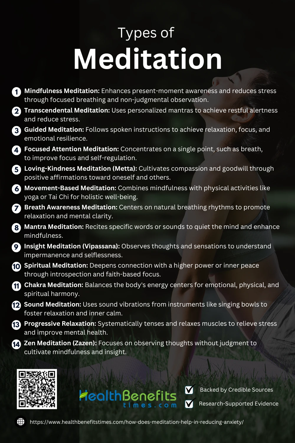 - Meditation can help reduce anxiety by promoting relaxation and enhancing mindfulness, which allows individuals to focus on the present moment and break the cycle of worry.