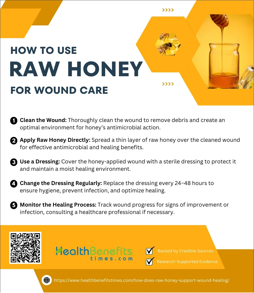 • Raw honey promotes wound healing through its antimicrobial, anti-inflammatory, and tissue-regenerating properties.