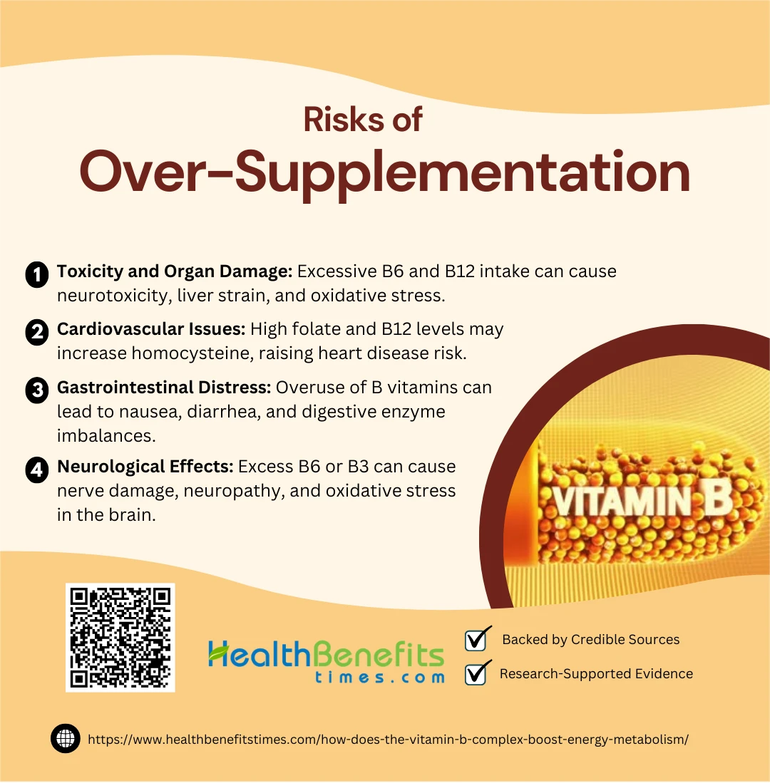 Over-supplementation of the Vitamin B complex can result in toxicity and organ damage, particularly from excessive intake of B6 and B12, leading to neurotoxicity and liver strain. Prolonged high doses may disrupt mitochondrial function and DNA repair mechanisms (90). Such imbalances increase oxidative stress and damage cellular structures (91).