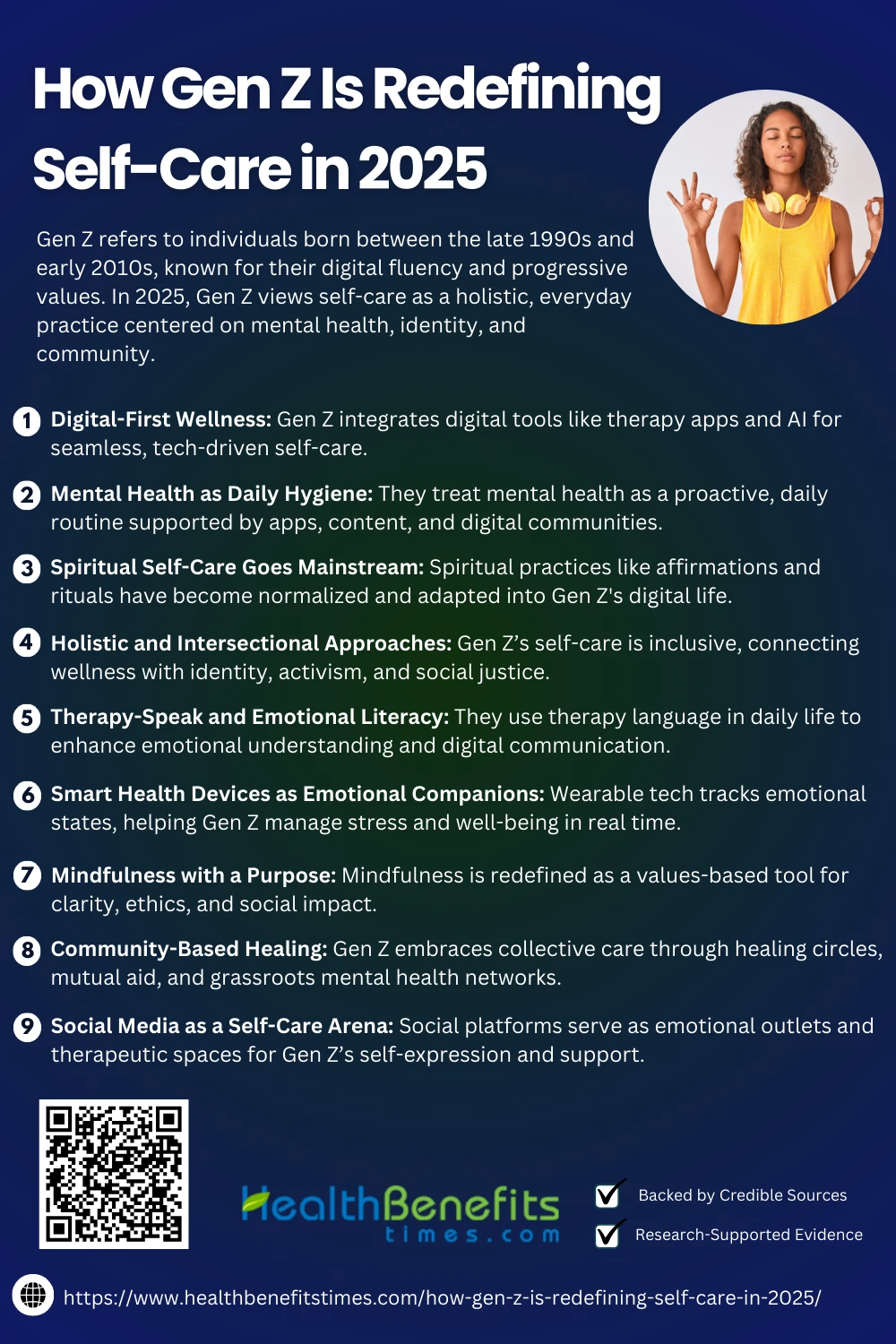 Self-care is defined as an individual’s ability to manage health by maintaining personal well-being, preventing illness, and coping with illness or disability—without direct medical intervention, often through physical, emotional, and social practices. In 2025, Gen Z is fundamentally reshaping the landscape of self-care, moving it from a commercialized wellness trend to a deeply integrated aspect of daily life that emphasizes authenticity, inclusivity, and mental sustainability. Unlike previous generations, Gen Z’s approach is more digitally native, decentralized, and socially conscious. They leverage AI-powered therapy apps, virtual meditation rooms, and neuro-divergent-friendly routines to support emotional well-being in a hyperconnected world. Their redefinition of self-care also includes political participation, boundary-setting content on social media, and a rejection of “toxic productivity” culture, demonstrating a preference for holistic, communal, and identity-based wellness frameworks. As Gen Z continues to advocate for destigmatizing mental health and embracing emotional realism, they are not only transforming how self-care is practiced, but also challenging institutions to keep pace with a more values-driven model of health.