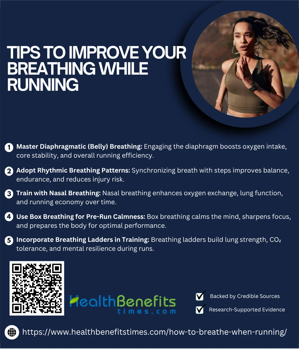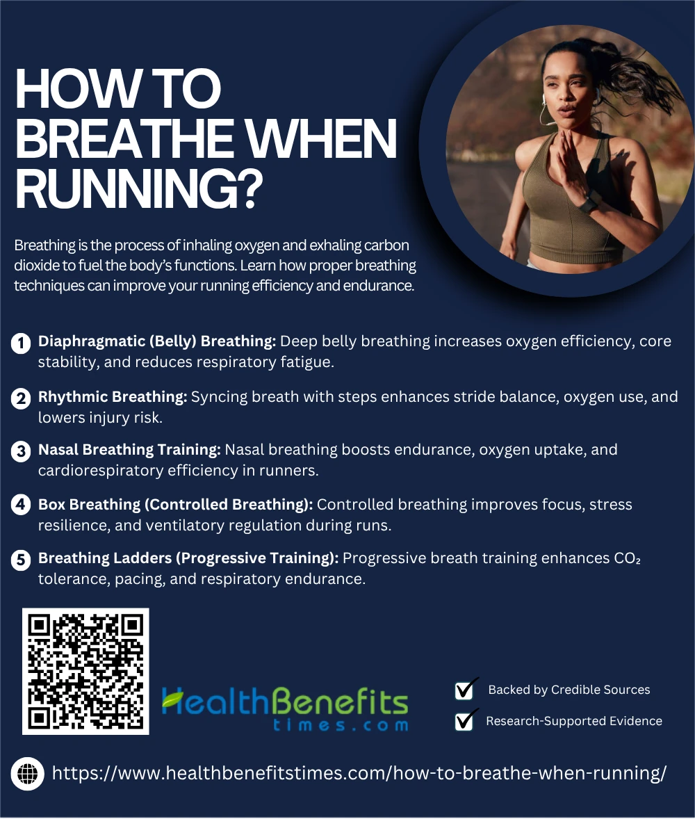 Diaphragmatic breathing, which emphasizes deep inhalation using the diaphragm rather than shallow chest expansion, significantly boosts running efficiency and endurance. It improves lung function and oxygen exchange, enhances pulmonary compliance in athletes, reduces respiratory muscle fatigue, and supports better core muscle engagement. (1✔) (6✔) (7✔) (8✔) Studies also affirm its role in stabilizing intra-abdominal pressure for performance gains. (9✔)