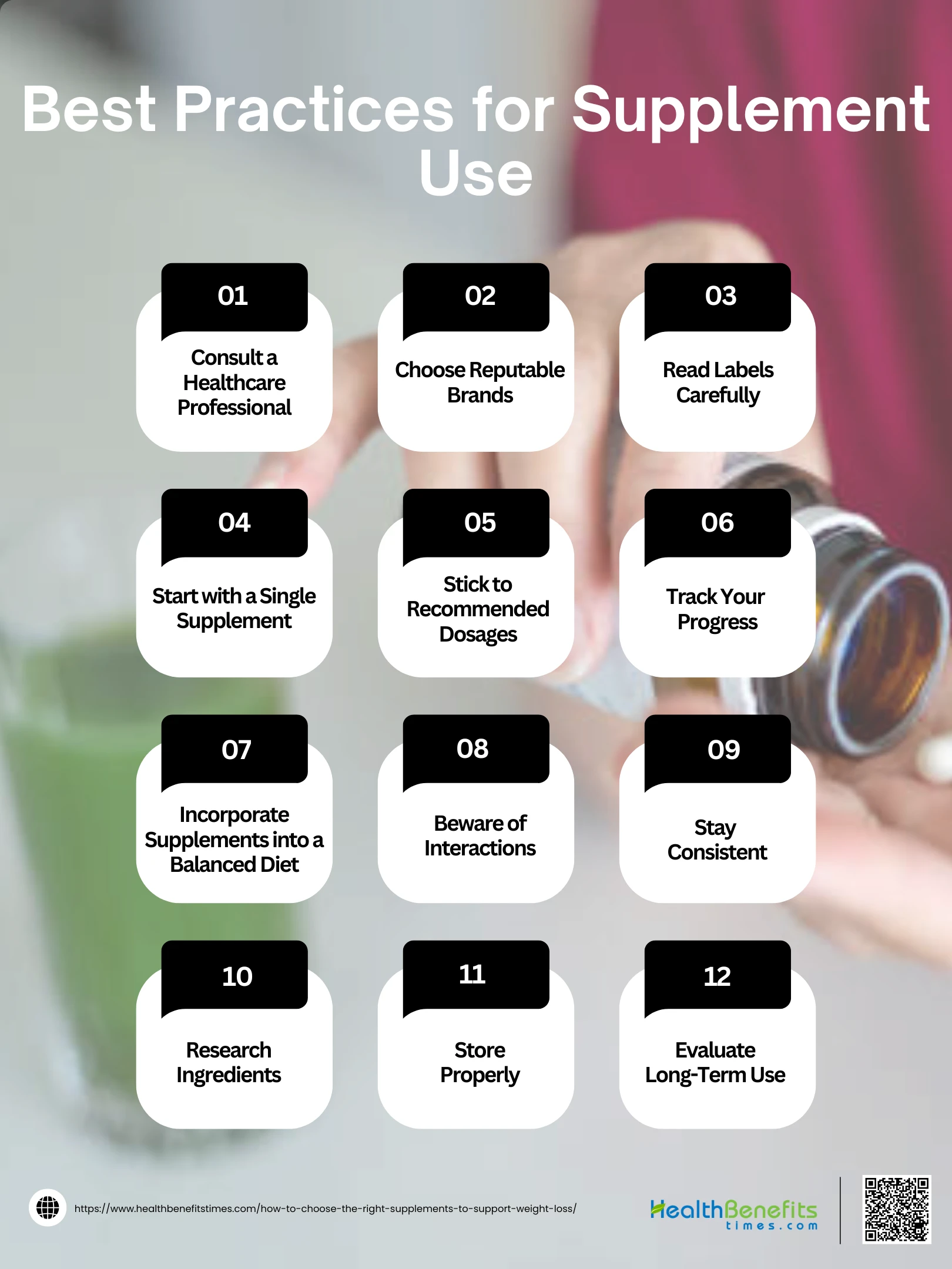 Using supplements effectively and safely requires a thoughtful approach that considers your individual needs and health status. While supplements can complement your weight loss or wellness journey, they should never replace a balanced diet or healthy lifestyle. By following best practices, you can maximize their benefits while minimizing risks. Here are some key guidelines for supplement use: