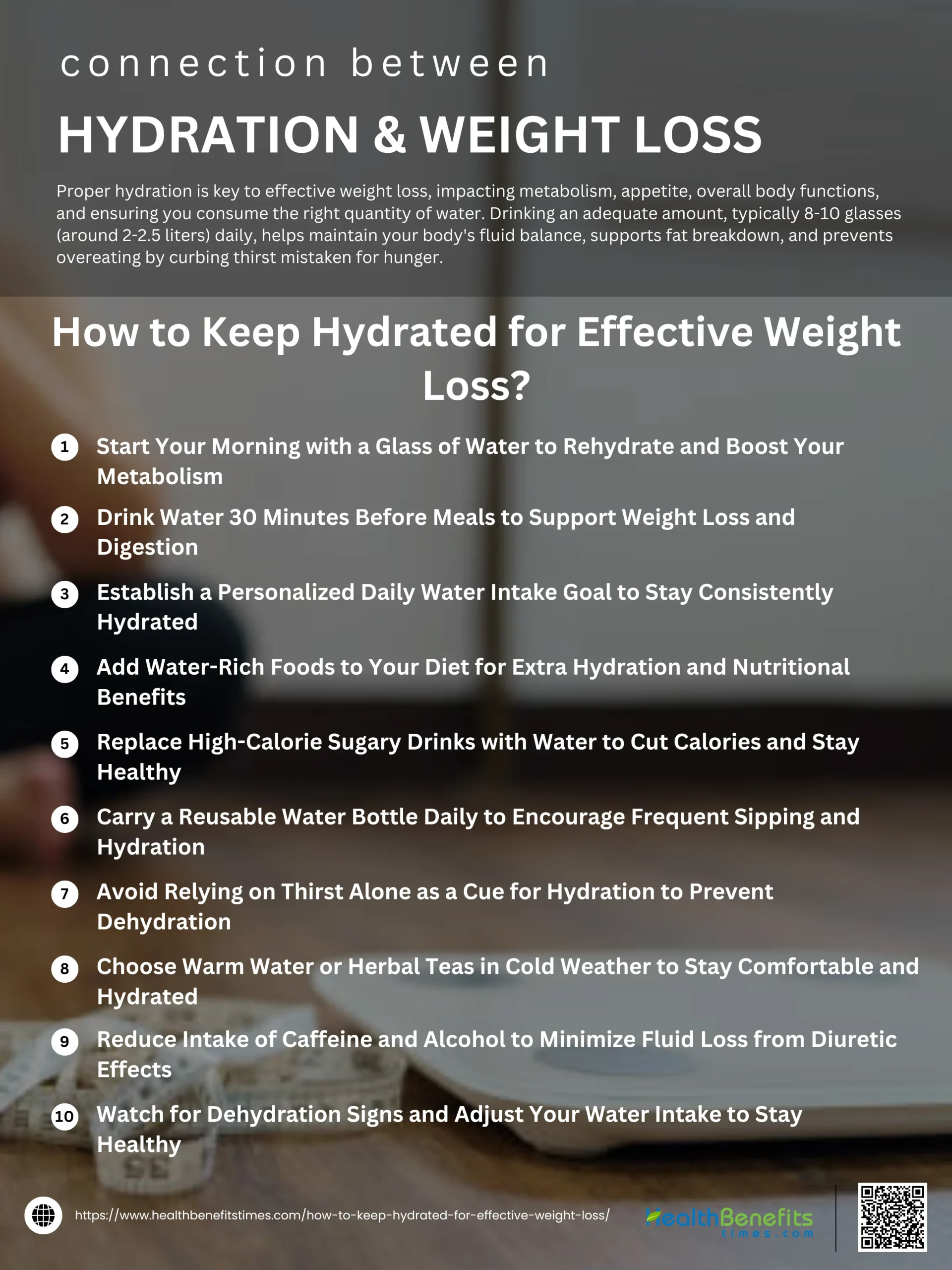 • To stay hydrated for effective weight loss, start your day with water, drink before meals, and aim for a personalized water intake goal.