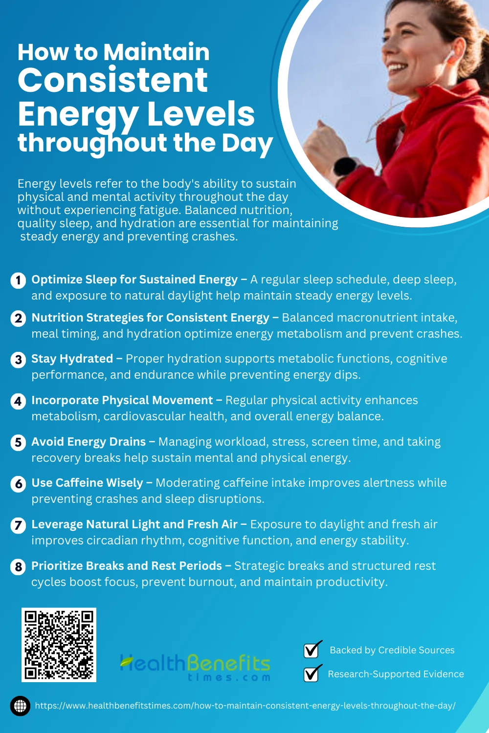 Incorporating physical movement throughout the day is essential for sustaining consistent energy levels. Regular physical activity enhances metabolic efficiency and prevents energy dips (30). Consistently engaging in movement improves cardiovascular health and energy regulation (31). Lifestyle integration of various physical activities further enhances energy balance (32). Motivating individuals to stay active helps sustain long-term energy levels (33).