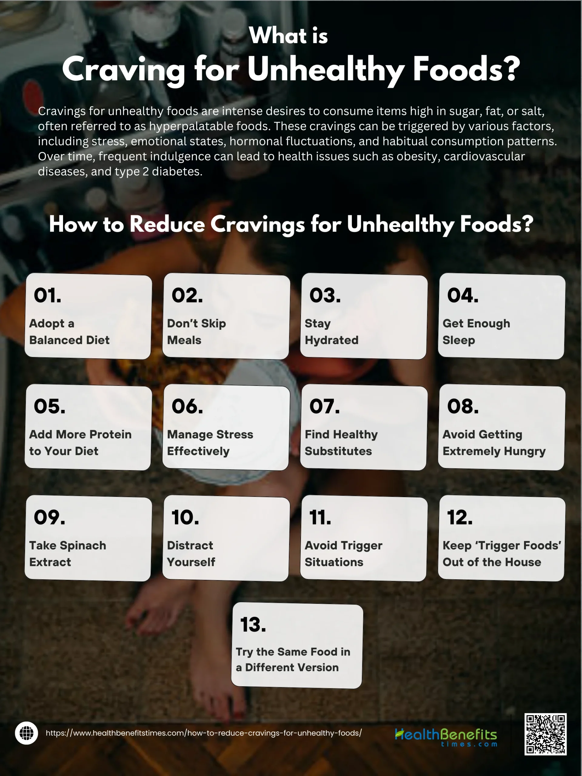 Reducing cravings for unhealthy foods begins with understanding your body’s signals and making conscious, sustainable choices. Cravings often stem from thirst, hunger, stress, or nutrient deficiencies, so staying hydrated and consuming balanced meals rich in protein can keep you feeling full and satisfied for longer. Regular eating schedules and healthy snacks help prevent extreme hunger, which often leads to poor food choices. Managing stress through activities like meditation, walking, or even a quick distraction can break the cycle of emotional eating. Quality sleep is also essential, as it regulates appetite-controlling hormones, reducing the likelihood of giving in to unhealthy cravings. By planning meals, practicing mindful eating, and keeping tempting foods out of reach, you can effectively diminish your cravings and enjoy a healthier, more balanced lifestyle.