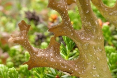 The whole lichen is very tough and springy. There is a distinct coloration to the body of the Iceland moss; the upper surface is always brown in color. On the other hand, the lower or the outer surface of the moss tends to have a much lighter shade of brown or is a gray brown with dispersed white spots all over it. There are white spots which have a chalky or mealy appearance, and which are lodged in little depressions of the thallus.