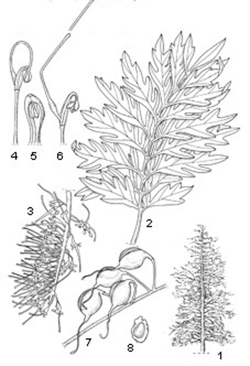 | Leaf | Alternate, fernlike, pinnately or almost bipinnately compound, 15-30 cm long and 9–15 cm wide, exstipulate with 11–31 primary lobes |