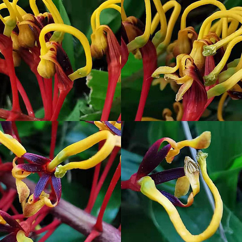 Flowers are showy, yellowish, numerous, paired, on long slender stalks 1-2 cm, composed of 4 narrow yellow or orange sepals 12 mm long. Flower clusters are 7.5-15 cm long, unbranched, arising mostly from the trunk, in a terminal or axillary simple or branched raceme, protandrous, petals 4, united into a tube that is mostly recurved under the broadened apex (limb); stamens 4, sessile in the concave limb; disk annular or semiannular, sometimes bilobed; ovary superior, 1-locular with 2 ovules, style curved and protruding from a slit in the perianth tube, the apex free from the limb, eventually straight, persistent. They bloom in perfusion from spring to early summer, with the most striking displays seen on near leafless trees.