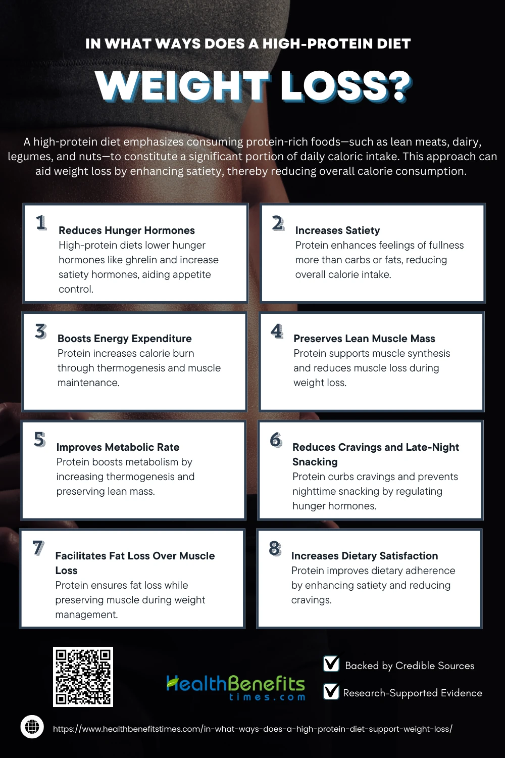 In conclusion, high-protein diets offer significant benefits for weight loss and overall health by enhancing satiety, preserving lean muscle mass, and boosting metabolism. These diets effectively regulate hunger hormones, improve energy expenditure, and support fat loss while maintaining muscle during caloric restriction. However, to maximize these benefits, it is crucial to balance macronutrients, incorporate diverse protein sources, and maintain proper hydration. While generally safe for healthy individuals, potential risks such as nutrient deficiencies, kidney strain, or cardiovascular concerns highlight the importance of moderation and tailoring dietary approaches to individual needs and health conditions.
