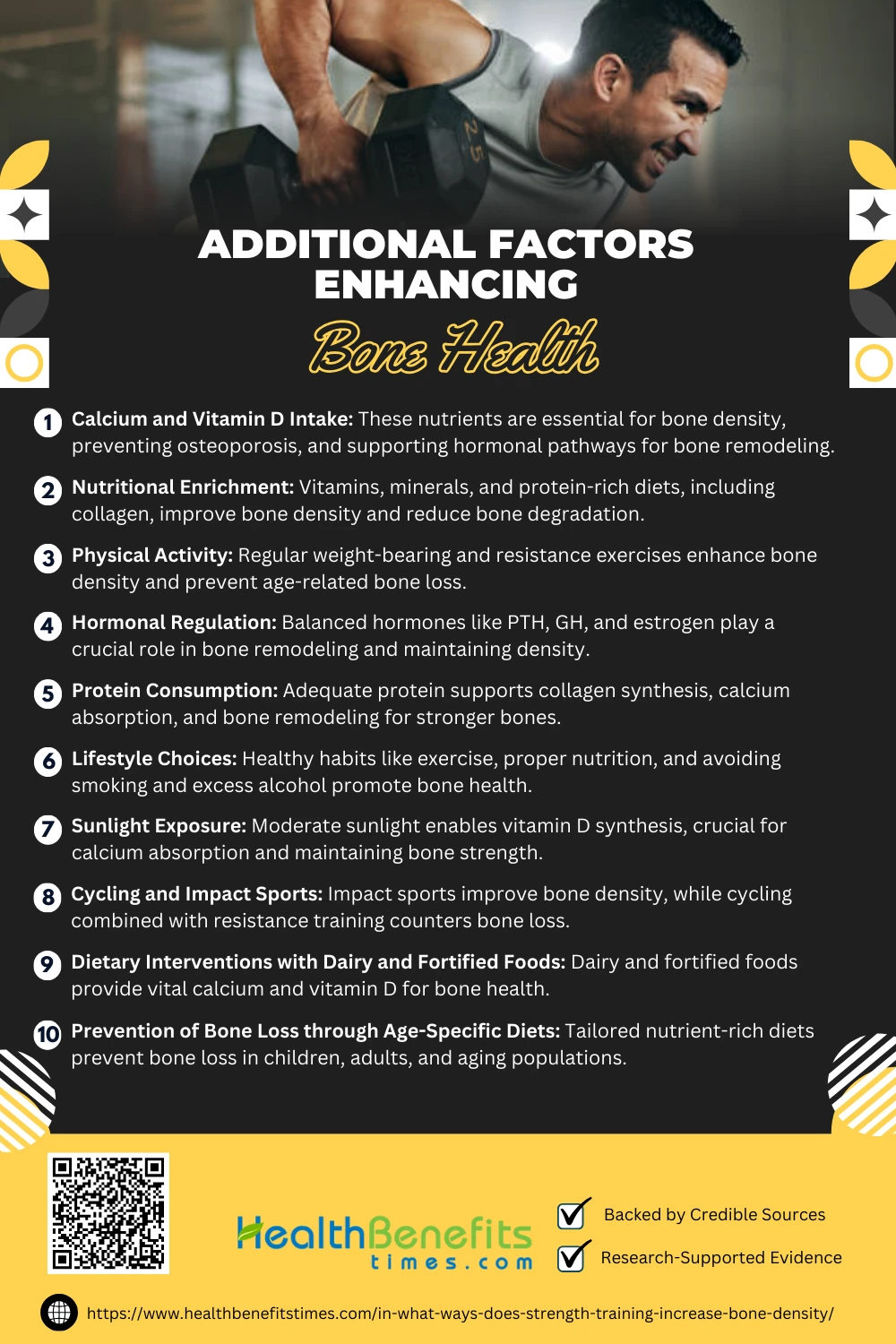 In addition to regular exercise, several other factors play a crucial role in enhancing bone health. Proper nutrition, adequate calcium and vitamin D intake, lifestyle habits, and hormonal balance are vital for maintaining strong and healthy bones. Understanding and incorporating these factors into daily routines can complement physical activity, prevent bone loss, and reduce the risk of osteoporosis and fractures. Addressing these aspects holistically ensures long-term skeletal strength and overall well-being.