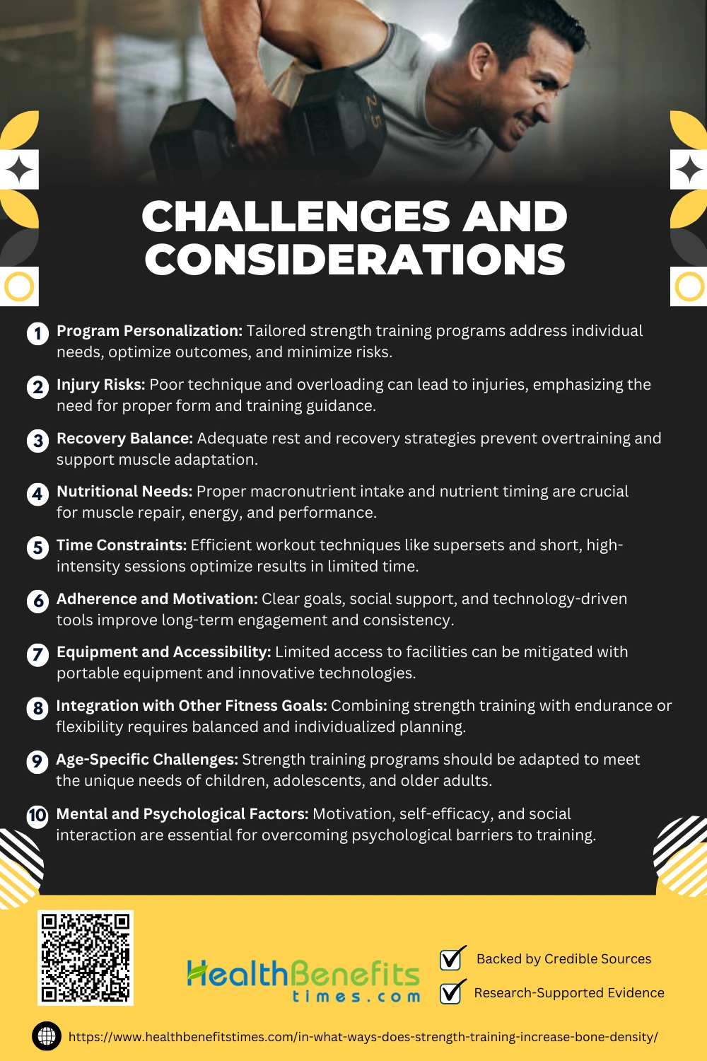 Strength training offers significant benefits for overall health and bone density, but it also comes with challenges and considerations. Proper technique, appropriate weight selection, and injury prevention are crucial for effective and safe training. Additionally, factors such as age, fitness level, and underlying health conditions must be taken into account. Understanding these challenges and addressing them with proper guidance can help individuals maximize the benefits of strength training while minimizing risks.
