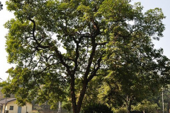 Leaves are large green colored, compound, alternate about 17.5-22.5 cm long usually 5-7 leaflets. Margin is curly and thick. Stipules are small, lateral, falling off. Petioles are round, flat, undulated and 6.5-11.1 cm long, slender and hairless and not having stipules. Leaflets are 5-7, alternate, estipulate; leaflet-stalk 6-10 mm, slender, hairless; blade 3.5-12.5 x 2-7 cm, elliptic-oblong, oblong-ovate or oblong, base blunt or pointed, tip blunt and notched, margin entire, hairless, leathery; lateral nerves 9-20 pairs, parallel, prominent. The tree is nearly evergreen or leafless for a short time in the hot season in April-May the new leaves appear in May-June.