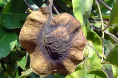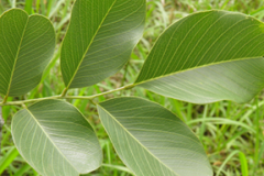 Leaf Leaves are large green colored, compound, alternate about 17.5-22.5 cm long usually 5-7 leaflets. Margin is curly and thick. Stipules are small, lateral, falling off. Petioles are round, flat, undulated and 6.5-11.1 cm long, slender and hairless and not having stipules. Leaflets are 5-7, alternate, estipulate; leaflet-stalk 6-10 mm, slender, hairless; blade 3.5-12.5 x 2-7 cm, elliptic-oblong, oblong-ovate or oblong, base blunt or pointed, tip blunt and notched, margin entire, hairless, leathery; lateral nerves 9-20 pairs, parallel, prominent