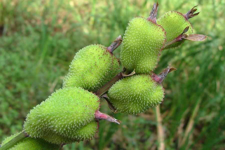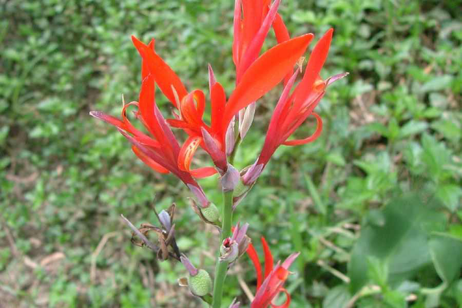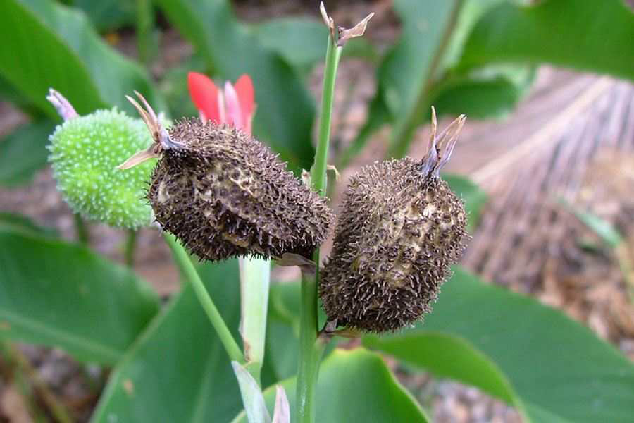 Canna indica, Indian shot or African arrowroot is a robust plant species in the family Cannaceae. The plant is native to south eastern United States (Florida, Texas, Louisiana, and South Carolina), Mexico, Central America, the West Indies and much of South America.  It  is  also reportedly naturalized in Austria, Portugal, Spain, Azores, Canary Islands, Cape Verde, Madeira, most of tropical Africa, Ascension Island, St. Helena, Madagascar, China, Japan, Taiwan, the Bonin Islands, India, Nepal, Sri Lanka, the Andaman Islands, Cambodia, Laos, Thailand, Vietnam, Burma, Java, Malaysia, the Philippines, Christmas Island, the Bismarck Archipelago, Norfolk Island, New  South Wales, Queensland, Fiji, Tonga, Vanuatu, Kiribati,  the Cook  Islands, the Society  Islands, the Caroline Islands and Hawaii. It has been a minor food crop cultivated by indigenous peoples of the Americas for thousands of years. Few of the popular common names of the plant are African arrowroot, canna, canna lily, edible canna, Indian canna, Indian shot, purple arrowroot, Queensland arrowroot, red canna, Sierra Leone arrowroot, tous-les-mois arrowroot, wild canna, English shot, bandera, saka, Indian reed and arrowroot.