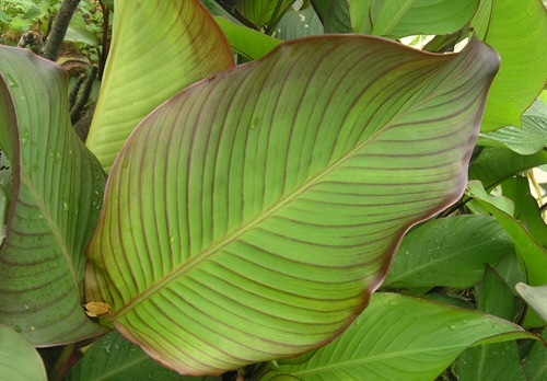 Leaves are large and foliaceous, lanceolate or ovate reaching up to 65-70 cm in length and 30-35 cm in width.  Having large laminae up to 60 cm long. Inflorescence is waxy-glucose erect peduncle about 30 cm long. Leaves are dark green with purplish brown margins and veins. They are carline, simple, alternate and spiral. The oblong leaves have their petioles extending downwards to form a sheathing base around the stem. The lamina is pinnately, parallel veined. Leaf margins appear smooth and wavy with acute apex.  Surface of the upper leaves are green, dark copper or purplish, while the lower surface covered with a layer of white as talcum powder.