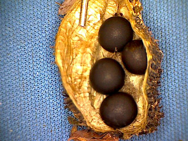 The papery capsules are oval (i.e. ellipsoid) to almost rounded (i.e. sub-globose) in shape, about 1.5-3 cm long and 1.5-2 cm wide and are crowned by the persistent sepals. They are initially green or purplish in color and covered in numerous short projections (i.e. they are verrucose), but turn brown as they mature and may lose some or all of their tiny projections. They split open at maturity to release numerous smooth, black, rounded (i.e. spherical) or egg-shaped (i.e. ovoid) seeds. These seeds are relatively large about 5-8 mm long and 4-7 mm wide and are very hard. Normally seeds are initially white and when mature, black with chestnut brown spots are protected with a smooth coat. Fruiting occurs mainly during October.