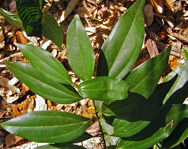 Leaves are alternate or sub opposite, rarely opposite. Petiole is 0.5-1.2 cm long, plano-convex and sub glabrous. Leaf blade is glaucous green and opaque abaxially, green and shiny adaxially, ovate or oblong to lanceolate, 5.5-10.5 cm long and 2-5 cm wide, leathery, glabrous on both surfaces, tripli-nerved, midrib and basal lateral veins very elevated abaxially, conspicuous adaxially, basal lateral veins arising 3-8 mm above leaf base, evanescent toward leaf apex, transverse veins and veinlets somewhat elevated on both surfaces, reticulate, base broadly cuneate, apex shortly acuminate. Older leaves are glabrous, glossy green above and glaucous pruinose below.