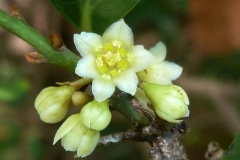 Inflorescence is a short axillary panicle. Flowers are borne on 4-12 mm long pedicel, perianth 4-5 mm long and after anthesis the lobes tear off transversely about half way. Stamens are about 4 mm long, and staminoides 2 mm. These small yellow flowers bloom in early summer.