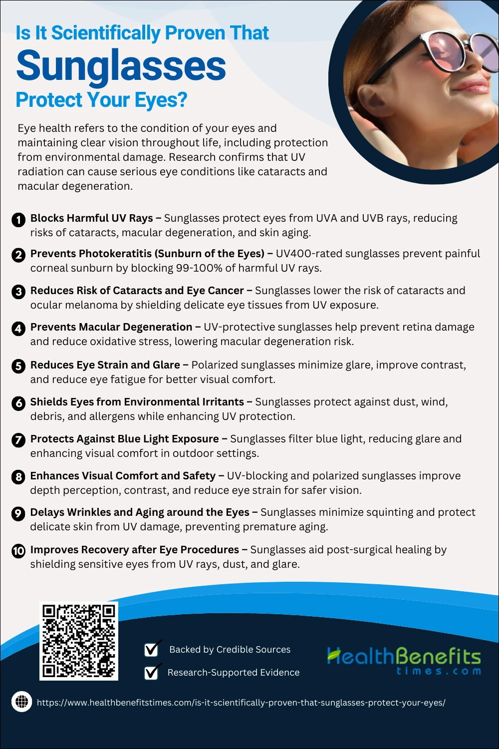 Sunglasses provide essential protection against environmental irritants like dust, wind, and airborne debris, preventing eye discomfort and long-term damage. They act as a barrier against harmful UV rays, which can cause corneal and retinal issues. (5✔) High-quality UV400-rated sunglasses offer 99% UV protection, reducing exposure to harmful light and allergens. (1✔) Additionally, they safeguard the eyes from harsh weather conditions, such as strong winds that can lead to dryness and irritation. (6✔) Scientists emphasize protective eyewear in various environments, including labs, to shield against airborne particles. (18✔) The UV coating on sunglasses enhances their ability to block damaging rays, ensuring optimal eye health. (19✔)