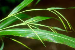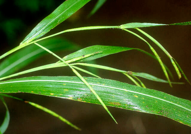Leaves are simple and alternate. The sheath is cylindrical, and slightly keeled and hispid over its entire length. It has white stiff hairs (tuberculate and perpendicular to the surface of implantation). The ligule is membranous, 1 mm high, barely cilliated at the top. The lamina is linear, flat, drawn obliquely acute apex, up to 1.5 m long and 1 to 2.5 cm wide, grooved white midrid. Blades are 25 to 40 cm long and 10 to 20 mm wide, flat, with hairs. Although larger dimensions of about 80 cm long and 45mm wide have been suggested as upper limits. The margin is scabrous. The upper surface is sparsely covered with long tuberculate hairs, the underside is glabrous.