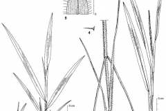 | Leaf | Leaves are simple and alternate. The sheath is cylindrical, and slightly keeled and hispid over its entire length. It has white stiff hairs (tuberculate and perpendicular to the surface of implantation). The ligule is membranous, 1 mm high, barely cilliated at the top. The lamina is linear, flat, drawn obliquely acute apex, up to 1.5 m long and 1 to 2.5 cm wide, grooved white midrid. Blades are 25 to 40 cm long and 10 to 20 mm wide, flat, with hairs |