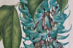 Strongylodon macrobotrys is beautiful because it has stunning flowers that will stay with you for a long time. These flowers grow in long, drooping groups that can be up to 90 cm long. Each cluster has 75 individual flowers, which is a lot. The flowers are shaped like curved tubes that are about 7 cm long. This makes them even more special. Their beautiful color, which runs from pale green to blue-green, is what really makes them stand out. This beautiful color comes from a pigment called quercetin that is found in the cell walls of the flowers. This is a very rare thing to see in nature. The flowers are joined at the bottom and end in a sharp point, which adds to their beauty.