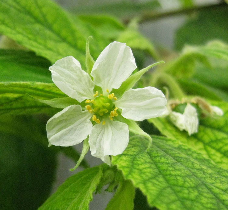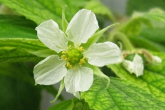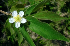 Flower 1.25-2 centimeters in diameter, white, extra-axillary, solitary or in pairs in the leaf axils with 5 green sepals that are reflexed, lanceolate, about 1 centimeter long. 5 white Petals are, obovate, 1 centimeter long, deciduous and spreading with many prominent yellow stamens
