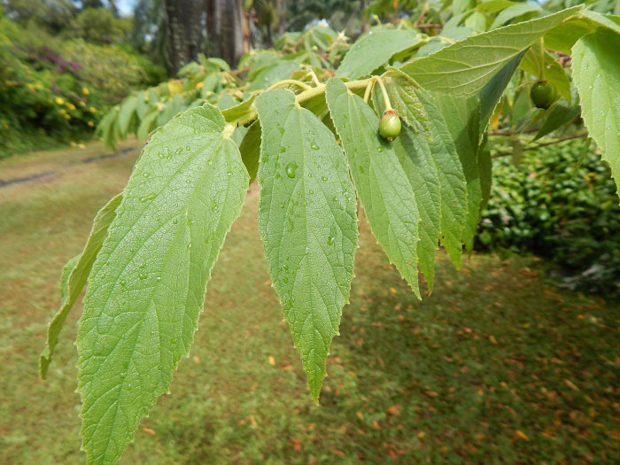 Jamaica cherry is a fast-growing small evergreen shrub or tree that grows about 25 to 40 ft. (7.5-12 m) in height, with spreading, nearly horizontal branches. The short bole can be up to 8.5 – 20 cm in diameter. The plant is found growing in disturbed lowland tropical forests, abandoned pastures, agricultural lands, forest edges, vacant lots, along roadsides and margins of waterways. The plant thrives in poor soils and it is also acidic and alkaline soils. Trunk is usually short, straight and of good form and supports a wide-spreading crown of long, gently drooping branches. Bark is grey-brown or pale-brown and smooth, on older trees becoming cracked and rough. Branches are horizontal, pendant towards the tip and soft-hairy.