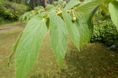 Leaves are evergreen, alternate, lanceolate or oblong, long-pointed at the apex, oblique at the base. They are 2 to 5 in (5-12.5 cm) long, dark-green and minutely hairy on the upper surface, gray- or brown-hairy on the underside and irregularly toothed.
