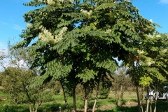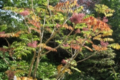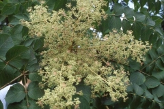 Large, dark green, alternate leaves 70-125 cm long, 50-90 cm wide, with 3-5 pinnae and are bi- or tri-pinnately compound. Leaves are pubescent beneath, with veins running to the ends of the serrations. Petioles are pubescent or becoming nearly glabrescent, unarmed and greenish. Leaves are arranged alternately and one leaf may contain as many 80+ ovate to elliptic leaflets (each to 3-4″ long). Leaflets are medium to dark green, ovate to broadly ovate, sometimes narrowly ovate to lanceolate, chartaceous, 6-15 cm long and 3.5-8.5 cm wide, acute to acuminate at apex, rounded to obtuse, occasionally sub cordate at base, serrulate to serrate, lateral veins 7-9 pairs, adaxial surfaces green, slightly rugose, sometimes scabrid, abaxial surfaces glaucous or brownish glaucous, pubescent to densely pubescent, sometimes pilose, pilose on veins, or glabrous, petiolules 0-6 mm long. In fall, leaves turn pale yellow to reddish purple and may drop early in season.