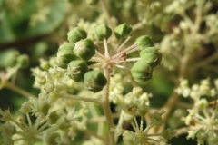 Small, 5-petaled, white flowers (to 1/8” across) bloom in large, terminal, umbellose panicles (25-55 cm long, 35-80 cm wide) in late summer (July through August). Floral buds are yellowish green. Flowers are quite showy and very attractive to bees. Flowers are greenish white colored. Sepals are minute, triangular to round. Petals are ovate, 1.8-2.2 mm long. Filaments are 2-2.5 mm long; anthers are yellowish white, oblong, 0.7-1.2 mm long. Ovary is 5-locular; styles distinct. Floral disc is projected. These flowers are wider than they are tall, radiate from separate stems within a cluster and lack a central axis.