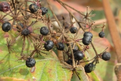 Fertile flowers are followed by clusters of small, fleshy, globose to subglobose drupes (4 mm in diameter) that ripen from late summer into fall. Fruits are initially green turning to purple to black colored berries. Fruits start appearing from August to September and ripening from September to October. Drupes are quite attractive to birds and distributed by wildlife. This invasive plant also suckers from its base and spreads.