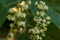 The flowers are able to pollinate themselves and can be found on terminal cylindric racemes or panicles. The small flowers have a cream-like color and bloom at the end of spring. They are 0.5-0.6 cm across, white, pubescent; pedicels 0.2-0.4 cm long; bracteoles are lanceolate, subulate and deciduous. Calyx lobes is 0.2-0.3 cm long, glabrous within; petals 0.15-0.2 cm long, cuneate, obtuse, glabrous; stamens 0.12-0.2 cm long; anthers dorsifixed; disc saucer-shaped; lobes linear; style 3-cleft and elongate. They are grouped in large clusters, even if the individual flowers are small. Sometimes the flowers only emerge at the end of summer if the weather is cold, which can hurt the fruit production. Flower-stalks start swelling unevenly after the decay of the flower into a fleshy, knotted mass, red, and sweet to the taste. They are chewed by the Japanese and Chinese. Flowering normally takes place in between May-July.