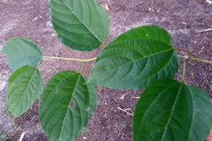 Leaves are simple, alternate, spiral, glabrous or glossy and smooth. Leaf blade is ovate, broadly oblong or elliptic-ovate, 7-17 cm long and 4-11 cm wide. Their real shape can only be revealed by spreading them wide. Leaves are papery or thickly membranous. Leaf margin is irregularly serrate or coarsely serrate, apex shortly acuminate or acuminate. They are green and glabrous (hairless) on upper side, pale green and glabrous to thinly pubescent (hairy) on nerves beneath, becoming deep brown when dry. Leaf stalk (petioles) is 2.5-6 cm long. Leaves do not change color in fall and drop while they are still green.