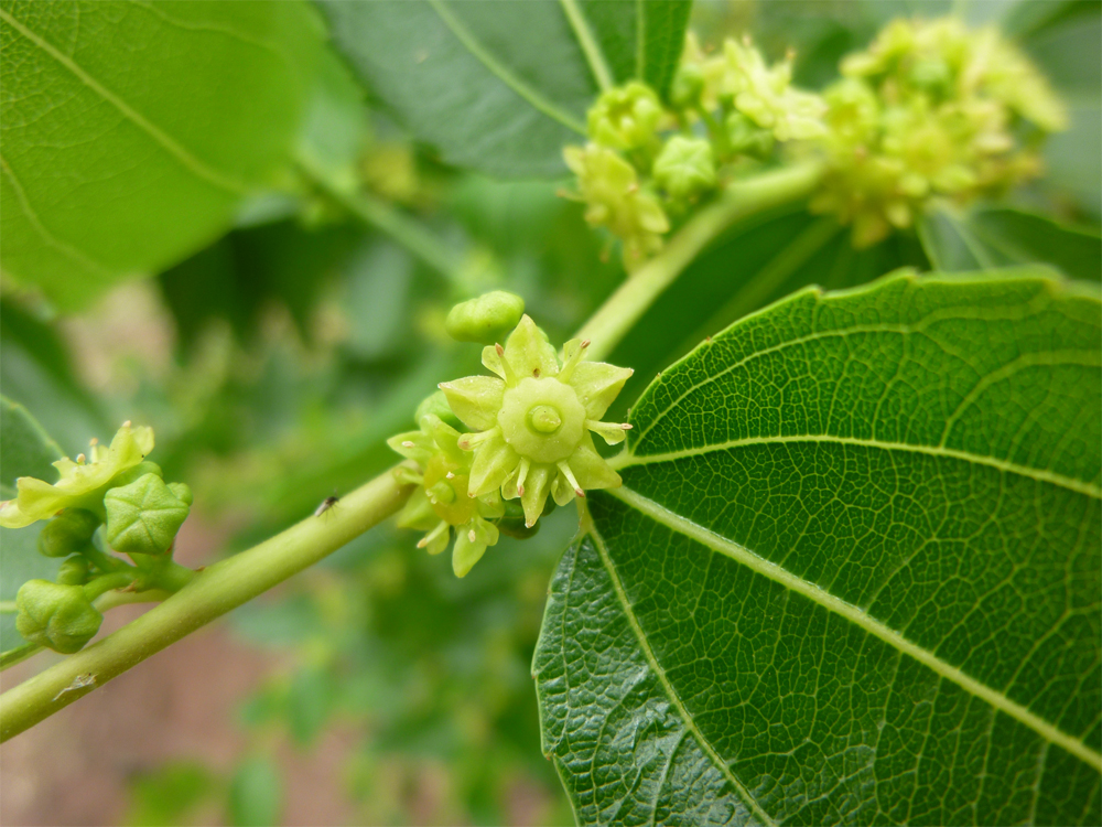 Flowers are inconspicuous, 1/5 inch diameter; white to greenish-yellow colored somewhat fragrant and produced in large numbers in the leaf axils. The flowering period extends over several months from late spring into summer. Though, individual flowers are receptive to pollen for only one day or less. Pollination is done by ants or other insects and possibly by the wind. Most jujube cultivars produce fruit without cross-pollination. The jujube is well protected from late spring frosts by delayed budding till all chance of cold weather has passed.