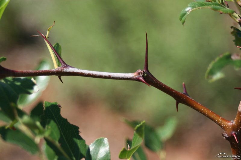 Leaves are small, ovate or oval and are 1-2 inches long and a shiny bright green. During autumn, the leaves turn bright yellow before falling. There are commonly two spines at the base of each leaf. Some spines may be hooked while others are long daggers. Nearly thorn less cultivars is known. As the growing season begins, each node of a woody branch produces one to ten branchlets. Most of these are deciduous, falling from the plant in autumn.