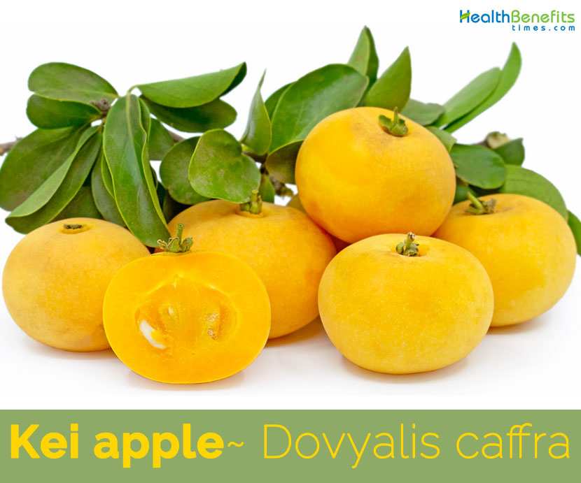 Kei apple has a rounded shape and petite size measuring around 6 cm in diameter. When ripe the tough skin of the Kei apple turns from green to yellow-orange and boasts a fuzzy coat, similar to that of a peach. Its flesh is mealy and juicy, like that of an apricot and surrounds two rings of central seeds and can contain anywhere between 5 and 15 seeds total. Its flavor is extremely acidic and for most people needs to be sweetened with sugar prior to consumption. In contrast to its flavor, the Kei apple offers a highly aromatic, sweet aroma when ripe. The tree does not fruit until it is 3 years old. In southern Africa, flowering and fruiting occur from November to January. The flowers are pollinated by insects and fruit take about 4 months to mature.