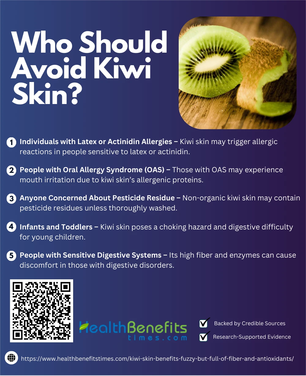 While kiwi skin is nutritious, it’s not for everyone. People with kiwi or latex allergies, or sensitive digestion, should avoid it to prevent allergic reactions or gastrointestinal discomfort.