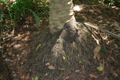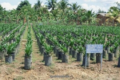 African oil palm is a tree which reaches to the height of 20 meters or more at maturity. Trunk is distinguished by persistent and spirally arranged leaf bases and has a crown of 20 to 40 massive leaves. Root system has primaries and secondaries in top 140 cm of soil. Leaves are erect, numerous and reaches 3 to 5 meters in adult trees. Leaf stalks are short having broad base. Leaf blades have 100 to 160 pairs of long leaflets having prominent midribs tapered to a point and form in groups or singly along midrib. Male or female inflorescences form on one plant. A single inflorescence has both male and female flowers. An inflorescence arises among leaf bases in large and very dense clusters having innumerable small flowers enclosed in bud stage in two large fibrous bracts that becomes deciduous. Fruits form in bunches and the average weight of each bunch is 23 kg but may also weigh upto 82 kg. A bunch has ovoid drupes about 4 cm long and 2 cm broad having pointed apex.