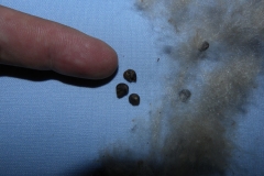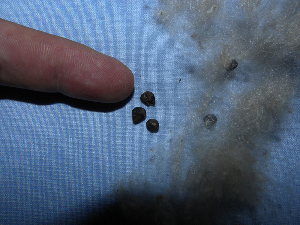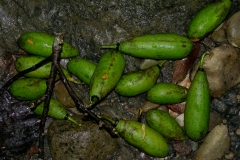 The fruit is a leathery, pendulous, ellipsoid capsule which is 10-30 cm long and 3-6 cm wide. The capsules split into 5 valves disclosing grey woolly hairs which embed 120-175 seeds.