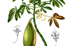 Native to Mexico, Caribbean, Central America, Northern South America and tropical West Africa, Kapok tree is cultivated widely in Southeast Asia for its seed fiber. Usually it is fast growing attaining the height of 70 meters with trunk diameter 3 meters. The trunk is buttressed with large simple thorns. Crown is thin and pagoda shaped. Leaves are palmate having 5-9 leaflets each. It has several pods which contains seeds covered by fiber which is yellowish, light, water resistant, very buoyant, flammable and resilient. It is used to stuff pillows and mattresses. Seeds are roasted and grounded into powder. Buds, tender leaves and fruits are prepared like okra. Flowers are blanched and consumed with chilli sauce. Dried stamens are added to soups and curries. On the other hand, bark decoction is used as aphrodisiac, diuretic and to treat headache and diabetes. In general, Kapok is used for spasms, fever and bleeding.