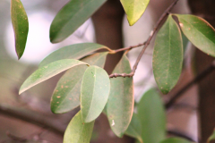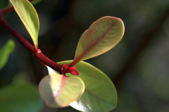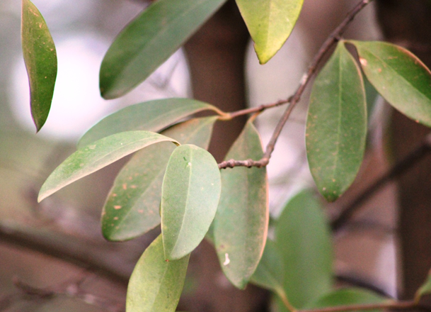 Leaves simple, opposite or rarely ternate, lanceolate-ovate to oblong-oblong, about 5.5-8 cm long and 2.5-3 cm broad, base acute to obtuse, margins entire, apex acute to acuminate, chartaceous, leathery, coriaceous, glabrous on both sides, with translucent glands, midrib impressed above and prominent beneath, lateral veins irregular with parallel short veins between, vein lets reticulate, petiole slender with raised margins, exstipulate, rarely stipulate. They are crimson red and soft when they emerge, becoming dark glossy green with a leather texture. They are arranged in pairs along stems, they remain on the tree in all seasons.