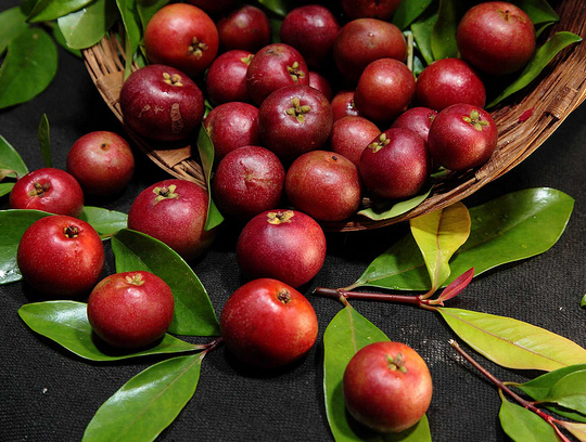 Fertile flowers are followed by round, oblong or oval fruit with pointed tips and, are crowned by the four parted stalk less stigma. They are 3 to 4 cm (1.2 to 1.6 in) in diameter. Initially kokum fruits are dark to light green in color turning to crimson red with a yellow tinge to dark violet or purple when fully ripe. The fruits grow up to the size of a lemon. An average kokum tree bears hundreds of fruits and each fruits weigh around 21–85 g. Kokum fruit contains three to eight large seeds and is covered with juicy, whitish pulp which delicious in taste and odor. Seeds are usually connected to the rind by tissue and embedded in a red acidic pulp similar to that in orange. Ripe fruits are sour in taste and have a short shelf life of approximately a week. High content of malic acid and little amounts of tartaric and citric acids give pleasant tart taste to the fruit. At present, India produces 10,200 metric tons of Kokum with productivity of 8.5 tons/ha.
