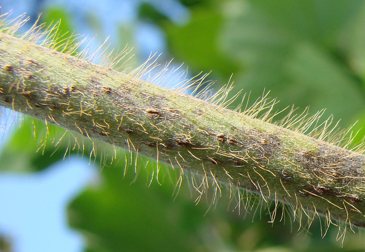 | Leaf | The very large alternately arranged leaves are compound with three leaflets (i.e. they are trifoliate) and borne on stalks (i.e. petioles) 8-13 cm long with long hairs, swollen bases, and deciduous stipules. Tips are pointed. Margins are thin membranous and fine golden hairy. |
