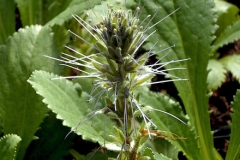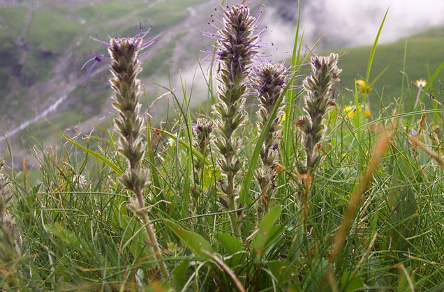 Flowers are small, pale or purplish blue, borne in cylindric spikes, spikes borne on almost leafless erect stems. Flowers are about 8 mm, 5-lobed to the middle, and with much longer stamens. Bracts are oblong or lanceolate, equaling the calyx. Sepals are lanceolate. Corolla units are five in number and have a cleft in the middle. Flowering stems are usually longer than the leaves. Flowering normally takes place from June to August. Fertilized flowers are followed by a two-celled, acute spherical capsule, tapered at top, dehiscing into 4 valves, 12 mm long. Seeds are many, white, with oblong curved raphae and about 1 x 0.8 mm in size.