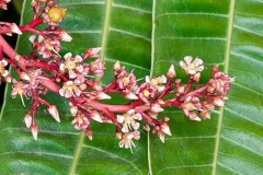 Kwini Mango is a medium-sized, evergreen tree that grows about 10–30 m, rarely more than 30 m high with a round or broadly ovoid canopy, straight trunk with grey, smooth or fissured bark, containing caustic sap. The plant grows well in any well drained slightly acidic soil. Leaves are irregularly scattered on rather thick branchlets, oblong-lance-shaped, measuring 12-35 cm long and 4-10 cm wide, coriaceous-chartaceous, with non-wavy edge, shortly acuminate, with prominent reticulated veins especially on the lower surface and not or hardly odorous when bruised. The petiole is 3-7cm and swollen at base.