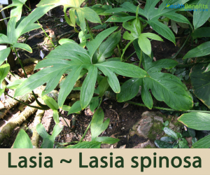 Lasia is a large, spiny, evergreen, herbaceous perennial plant with underground rhizome that normally grows up to 1.5 m tall. The plant is found growing in primary rainforest, freshwater swamp forest, riverine, freshwater pond, lake, river, riverbanks, ditches, moist places in tropical and subtropical forests, sometimes cultivated along fish ponds and rice fields. The plant grows best in waterlogged soils that are rich in nutrients. Lasia plants spread by means of a stem. Stems are long creeping and stoloniferous, erect or ascending, 2.5 cm in diam., internodes with stout prickles. The stem and leaves of the plant are edible and have various medicinal uses.