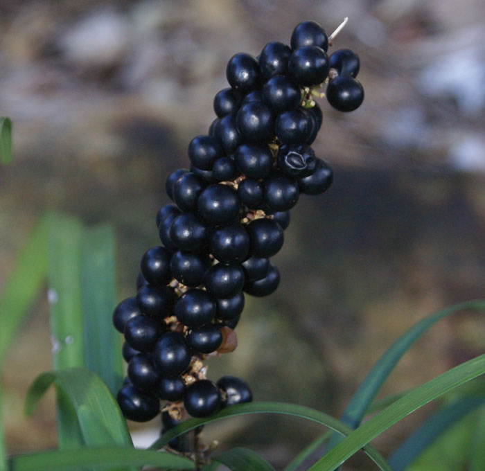 Lily turf is a small, broadleaf evergreen, clump-forming, herbaceous perennial plant that normally grows about 30–45 cm (12–18 in) tall. The plant is found growing in forests, bamboo forests, scrub, shady and moist places in ravines and on slopes. It tolerates a wide range of soils and soil conditions, but it doesn’t like constantly wet or boggy soil. Roots are fibrous, often with terminal tubers. Grass like tufts of initially interconnected plants lack a central stem, except for the flower/fruit stalks. The plant has clumps of strap-like, arching, glossy, dark green leaves (to 1″ wide). Clumps slowly expand by short stolons, but do not spread aggressively like Liriope spicata.