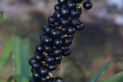 Fertile flowers are followed by spherical, green, berrylike drupes turn blue ripening to black purple, 0.2 to 0.3 inch (6 to 8 mm) wide. Fruit has a grapelike skin and little to no pulp and contain a single spherical dark seed.